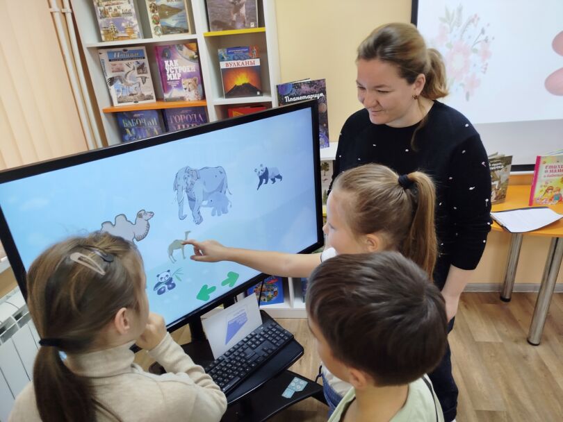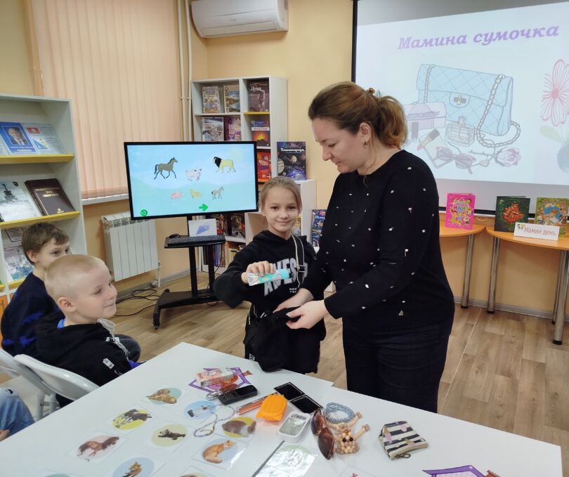С большим азартом приняли участие в игре, где с закрытыми глазами на ощупь пытались определить предметы из маминой сумочки. С помощью интерактивной панели, дети играли «Найди мою маму», находили детенышей животных.