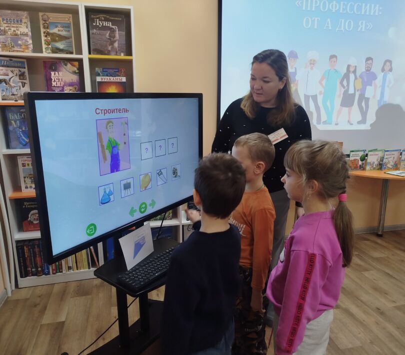 Библиотекарь рассказала о многообразии профессий, ребята узнали, чем занимаются люди разных профессий, какими качествами необходимо обладать. С помощью интерактивной панели девчонки и мальчишки определяли какому профессионалу принадлежат предметы — помощники.