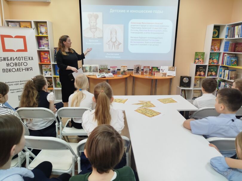 В истории нашей страны есть герои, чьи имена помнят спустя сотни лет. Один из них – выдающейся полководец, великий князь древней Руси — Александр Невский. Он был не просто великим воином, но и мудрым политиком.В модельной детской библиотеке-филиале № 13 «Книжный мир» для учащихся 3 – Б класса ГБОУ «СОШ № 4 имени А. Н. Кесаева» состоялся познавательный час «Александр Невский – защитник земли русской»