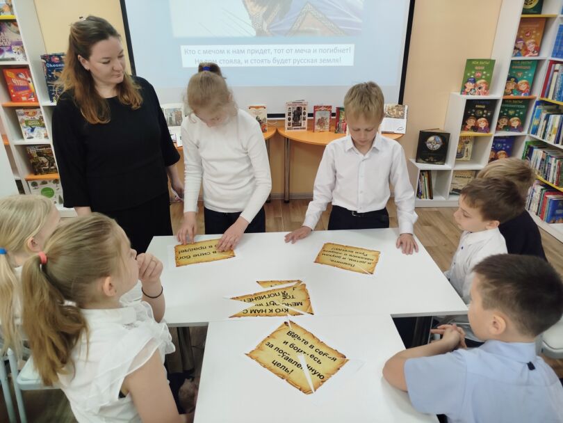 Юные читатели приняли участие в викторине «Вопросы дружиннику», где отвечали, что означает слова «дружина», «кольчуга». В завершении мероприятия ребята собирали рассыпавшуюся летопись по фрагментам с мудрыми высказываниями Александра Невского, смогли побыть в роли экскурсоводов и приняли участие в проведении экскурсии, которая называлась «Дорогами Александра Невского».