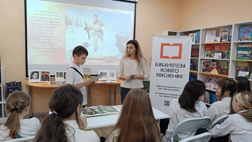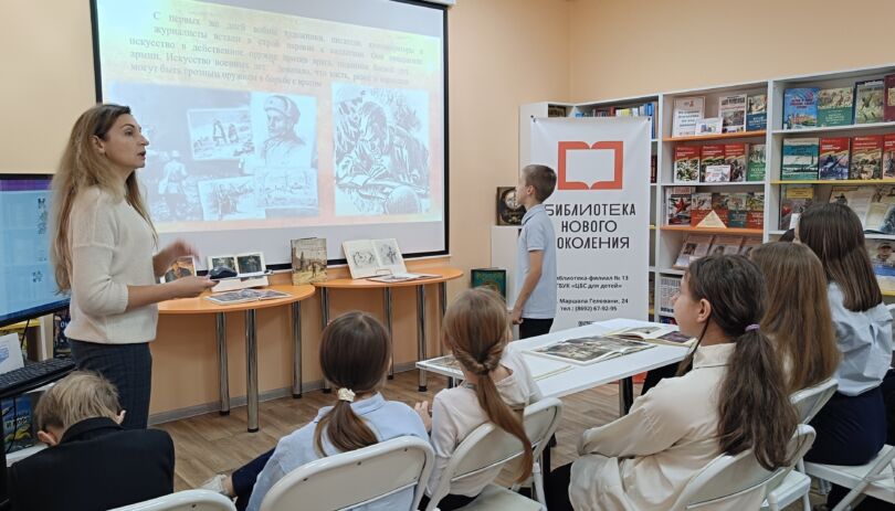 В рамках патриотического проекта «Я знаю! Я горжусь!» в центре литературы по искусству модельной детской библиотеки-филиала № 13 «Книжный мир» состоялся вечер-портрет «Художник на фронте». Учащиеся 5-В класс ГБОУ «СОШ № 4 имени А. Н. Кесаева» узнали о роли искусства в самые тяжёлые дни нашей истории, какой вклад внесли военные художники в годы Великой Отечественной войны.